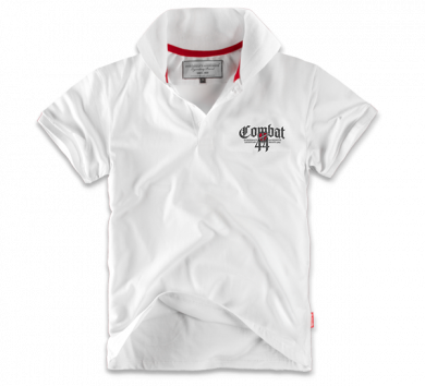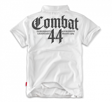 Póló ing hátán egyszínű grafika és felirattal Combat 44. Dekoratív betükkel irva. A bal mellen ismétet nyomtatás. Annak a közepén hímzett pajzs és kerest jelvény formájában. Klassikus férfi galléros póló, bordázott mandzsettával részletesen piros szegély és marka embléma.100% pamutból készült.