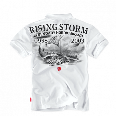 Rövid ujjú féerfi póló magas minőségűpamutból készült, kiegészitet varorrámával.Rögzitve három gombra, belső elvarrás kontrasztos színben.Mellkason kis méretu N.Storm embléma megismételve hátoldalon nagyob méretben.Plusszban hátán cimke, kétszinü pajzs és nagy egyszinü nyomtatás skandináv motívummal.Grafika viking hajót ábrázolja, amely latható durva tengeren.Feljebb Rising Storm feliratt. Nyomtatásának repedés hatásávan.