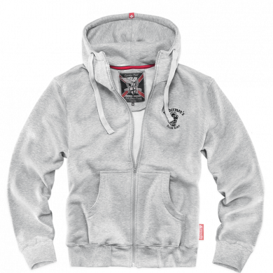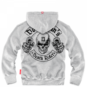 Férfi pulóver nyaknál magasan begombolva. Gallér áthalad háttérben. Fém vasalat és zsinór kapucnivál, elején két zseb. Pulóver hátoldalon díszített koponya motivum grafikával és Doberman's Death Rider emblémával amely belevan irva bannerben. Minta elfoglalja jelentős terület. Egyszinü nyomtatás,látható repedés hatása. Bal mellkason fegyver és gyűjtemény neve embléma.