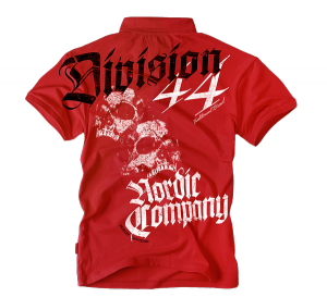 Póló ing, minőségű pamutból készült. Standard módon varrott férfi póló, kiválóanyagbol 100% pamutból készült, 200 g vastagságú. Háromgombos fazonok , nyaknál csatlakoznak, galléros póló bordázott mandzsettával. A póló bal mell részen Nordic Company felirás gótikus betűkkel. Két koponya grafika és szöveg fölett és alatt. Használva 44 szám szimbólum. A minta áthalad a bal ruháé varraton megy át.