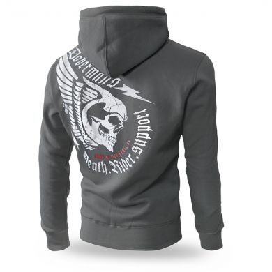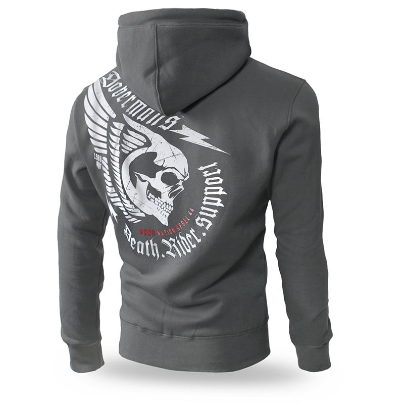Cipzáras kapucnis pulóver. A pulóver kiváló minőségű pamutból készült, melynek súlya 320g. A kapucni beállításához praktikus fűzők szolgálnak, végein fémből készült logókkal. A pulóver elején két praktikus zseb található. A nyomat egy szárnyas koponyát ábrázol, „Death Rider Support” felirattal kiegészítve. A pulóver elengedhetetlen nemcsak a motorosok számára. A termék elején a nyomat kisebb méretben megismétlődik.