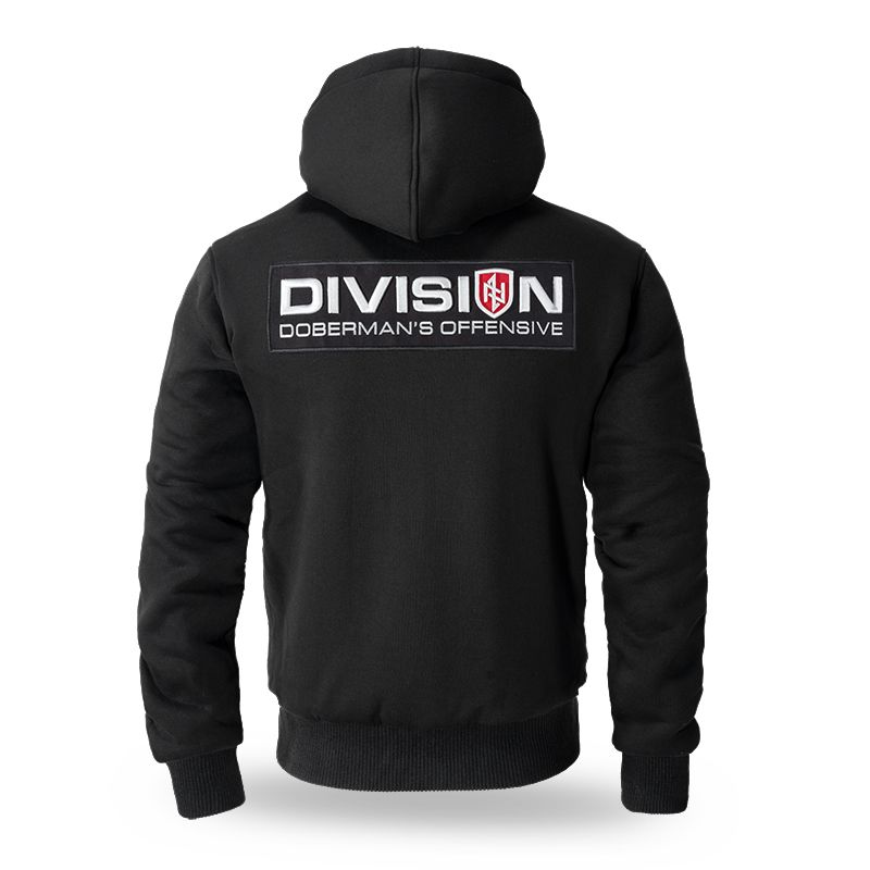 Szőrmével ellátott klasszikus cipzáras pulóver. A pulóver elején két praktikus zseb található. A kapucni beállításához praktikus fűzők szolgálnak, végein fémből készült logókkal. A pulóver alsó részén és az újjak végein elasztikus szegély található. A pulóver mellkasán egy pajzs alakú 3D-s hímzés található, amely a cég logóját ábrázolja „DIVISION Doberman’s Offensive” felirattal kiegészítve.