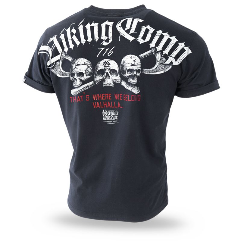 Klasszikus férfi póló, amely nagy súlyú pamutból készült. A póló bal ujján egy kis méretű Dobermans Aggressive logó található. A póló hátoldalán három koponyával és egy baltával kiegészített Viking Comp felirat található. A póló hátoldalát egy „That’s where we belong Valhalla” felirat egészíti ki.