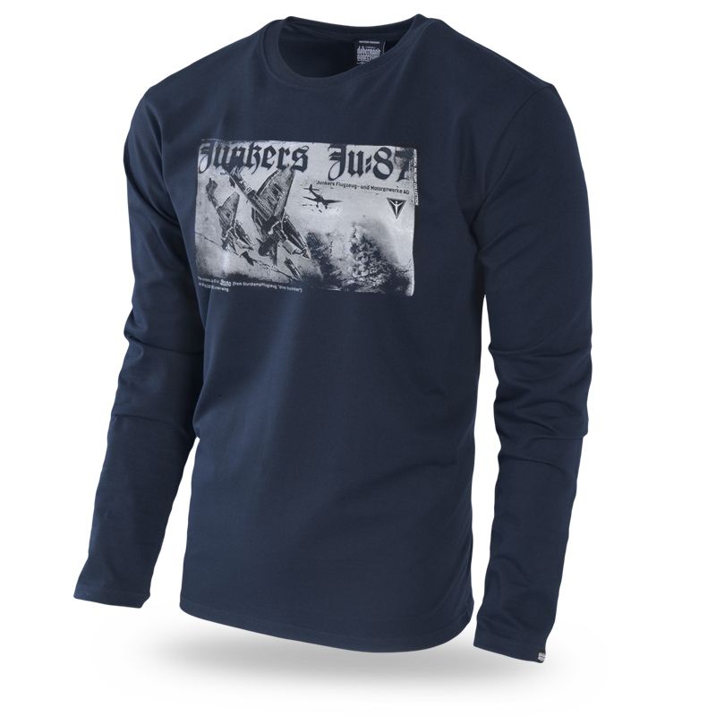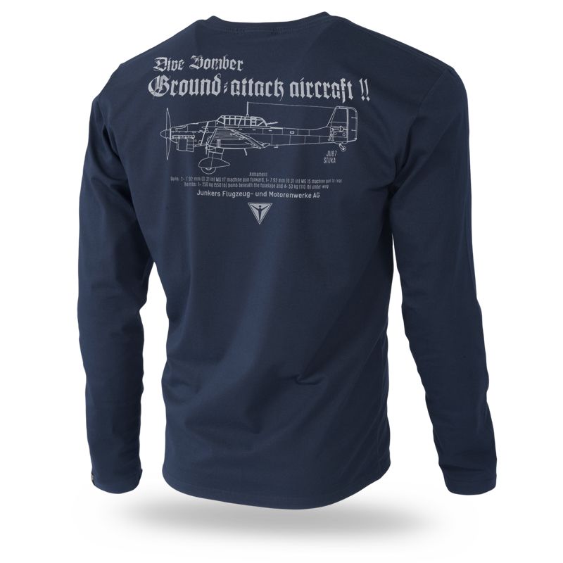 Klasszikus szabású hosszú ujjú férfi póló. A póló kiváló minőségű pamutból készült. A póló nyakánál elasztikus szegély található. A póló elején található mintán Ju87 típusú második világháborús bombázók vannak kiábrázolva, gótikus stílusú Junkers Ju87 felirattal kiegészítve. A hátoldalon a repülőgép vázlata és a fegyverzet leírása található.