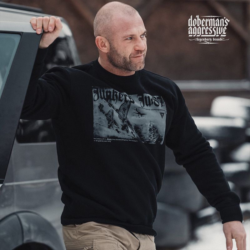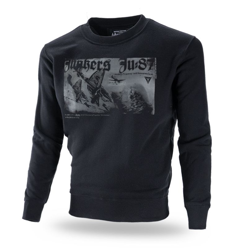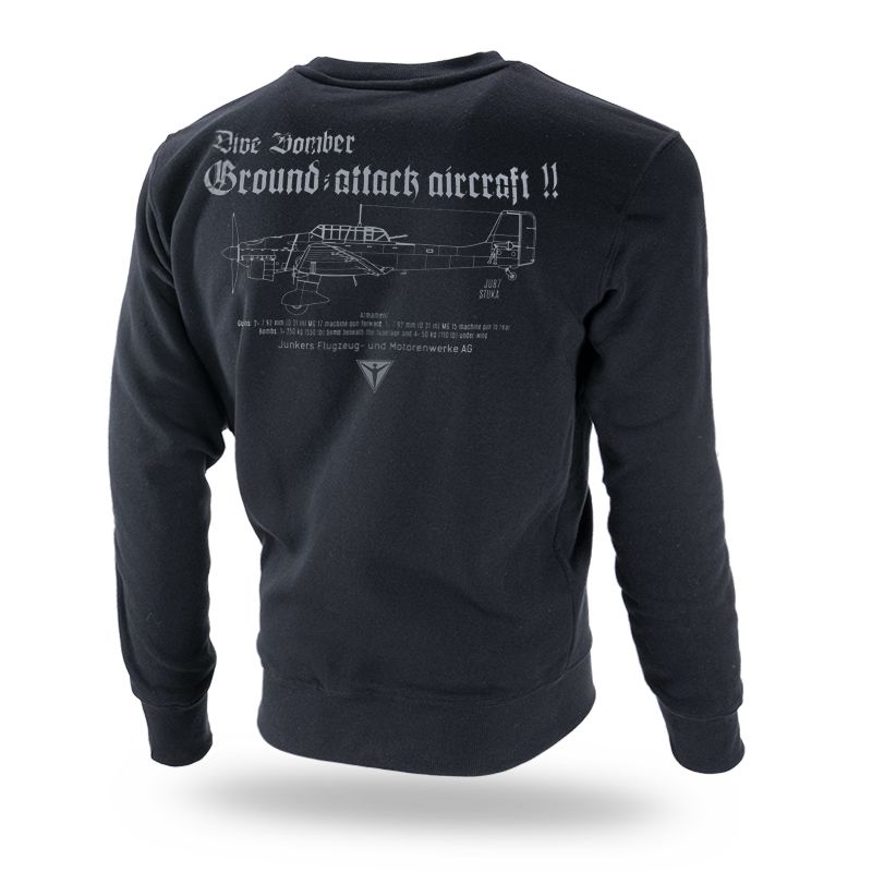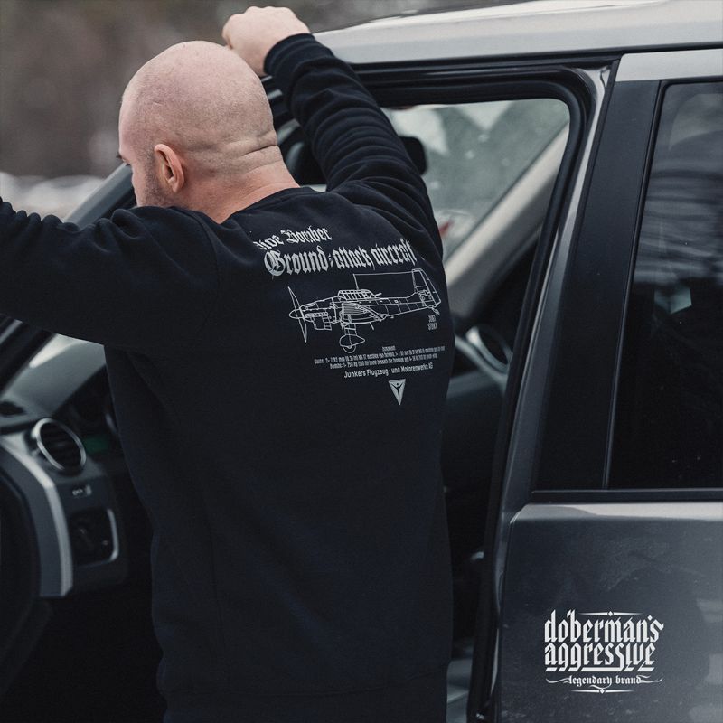 Klasszikus férfi pulóver, amely kiváló minőségű 320g pamutból készült. A pulóver alsó részén és az újjak végein elasztikus szegély található. A pulóver bal ujján egy kis méretű Doberman’s Aggressive logó található. A pulóver elején található mintán Ju87 típusú második világháborús bombázók vannak kiábrázolva, gótikus stílusú Junkers Ju87 felirattal kiegészítve. A hátoldalon a repülőgép vázlata és a fegyverzet leírása található.