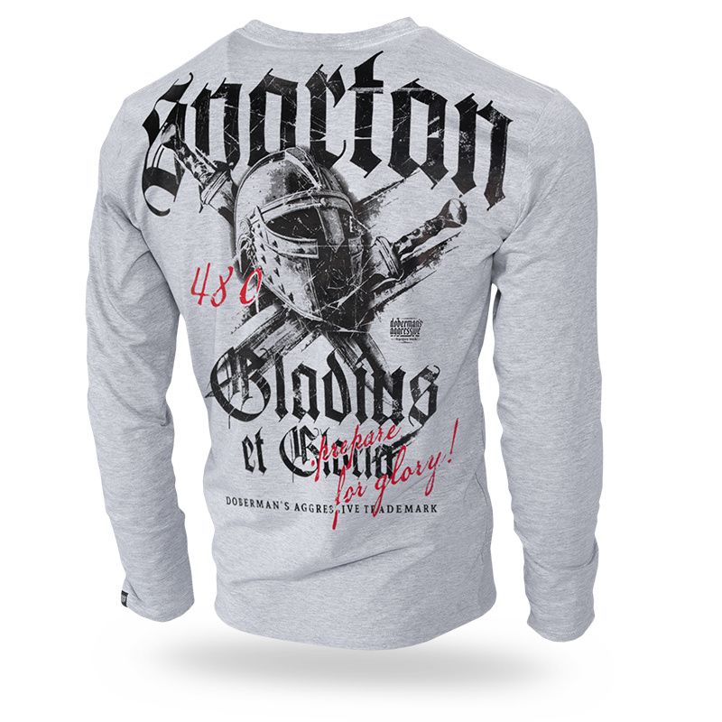 Klasszikus hosszú ujjú férfi póló, elasztikus nyakszegéllyel. A póló minőségi pamutból készült.A bal ujjon egy kis méretű címke található a márka logójával. A mellkas bal oldalán egy kis Gladius of Glory felirat található. A póló hátoldalán keresztezett kardokat és sisakot ábrázoló minta található. Az egész mintát a "SPARTAN GLADIUS OF GLORIA" felirat zárja.