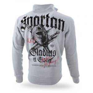 Cipzáras pulóver modell magas gallérral. Elöl két zseb található, a bal ujjon pedig egy kis Dobermans Aggressive logóval ellátott címke.A pulóver alsó része és az ujjak elasztikus szegéllyel vannak ellátva. A pulóver kiváló minőségű pamutból készült. A mellkas bal oldalán egy kis Gladius of Glory felirat található. A pulóver hátoldalán keresztezett kardokat és sisakot ábrázoló minta található. Az egész mintát a "SPARTAN GLADIUS OF GLORIA" felirat zárja.