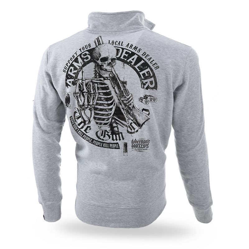 Magas gallérral ellátott cipzáras pulóver. A pulóver elején két zseb, a bal ujjon egy kis Dobermans Aggressive logóval ellátott címke található. A pulóver alsó része és az ujjak elasztikus szegéllyel vannak ellátva. A pulóver kiváló minőségű pamutból készült. A pulóver hátulján egy nagy méretű minta található, amelyet egy fegyveres csontváz, valamint egy " Support your local arms dealer " felirat díszít. A pulóver elején egy kisebb méretű hasonló minta található.