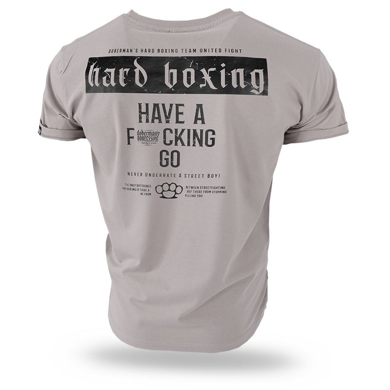 Klasszikus szabású rövid ujjú férfi póló, kerek gallérral. A póló kiváló minőségű pamutból készült. A bal ujjon egy kis címke található a márka logójával. A póló hátoldalán egy Hard Boxing - Have A F*cking feliratú minta található.