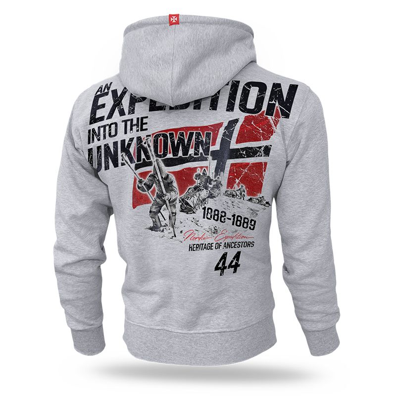 Cipzáros férfi pulóver, amely magas gallérral és kapucnival van ellátva. A kapucni beállításához praktikus fűzők szolgálnak, végein fémből készült logókkal. A pulóver kiváló minőségű, 320g-os pamutból készült. A pulóver bal karján kis méretű Dobermans Aggresive céges logó található. A pulóver bal elülső oldalán egy norvég zászló található. A pulóver hátoldalán nagy méretű nyomat, amely két havon átkelő utazót ábrázol. A háttérben egy nagy méretű zászló, fölötte An Expedition into the Unknown felirat. A pulóver az Expedition kollekció modellje.