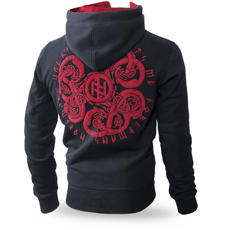 Cipzáros férfi pulóver, amely magas gallérral és kapucnival van ellátva. A kapucni beállításához praktikus fűzők szolgálnak, végein fémből készült logókkal. A pulóver kiváló minőségű pamutból készült. A pulóver elején két praktikus zseb található. A bal oldali mellkason a rúna szimbólumokat hímezték. A pulóver hátsó része egy nagy nyomtatást tartalmaz, tömlőszövéssel és zárt szimbólummal egy körben. A nyomtatás 3D nyomtatási technológiával készült.