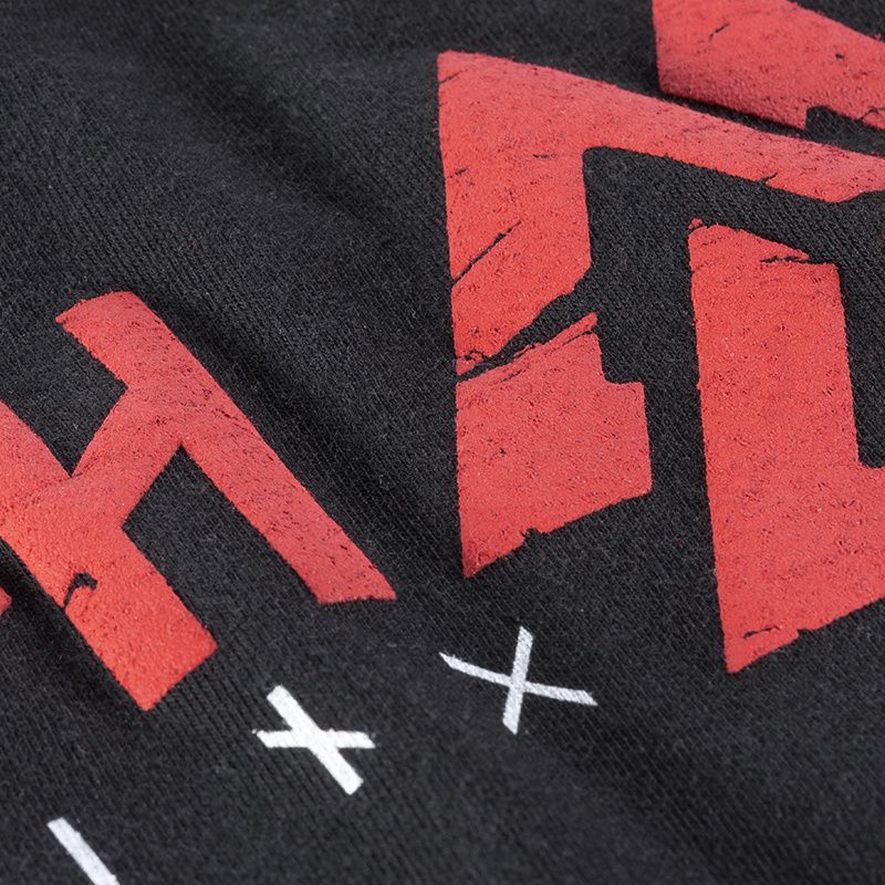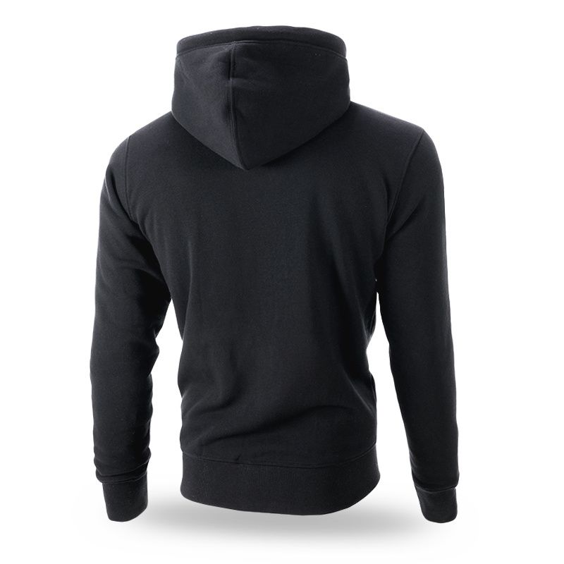 Kiváló minőségű pamutból készült kenguruzsebes pulóver, kapucnival és nagy zsebbel az elején. A pulóver alsó része és az ujjak végei széles húzózsinórral vannak ellátva. A bal ujjon egy kis címke található a márka logójával. A pulóver elején egy domború nyomattal készített Valhalla felirat található. A nyomatot egy északi szimbólum teszi teljessé.