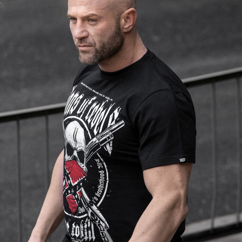 Klasszikus pamut póló a Rebel kollekció modellje. A pólón lévő nyomaton egy koponya és keresztezett puskák találhatóak, gótikus feliratokkal kiegészítve.