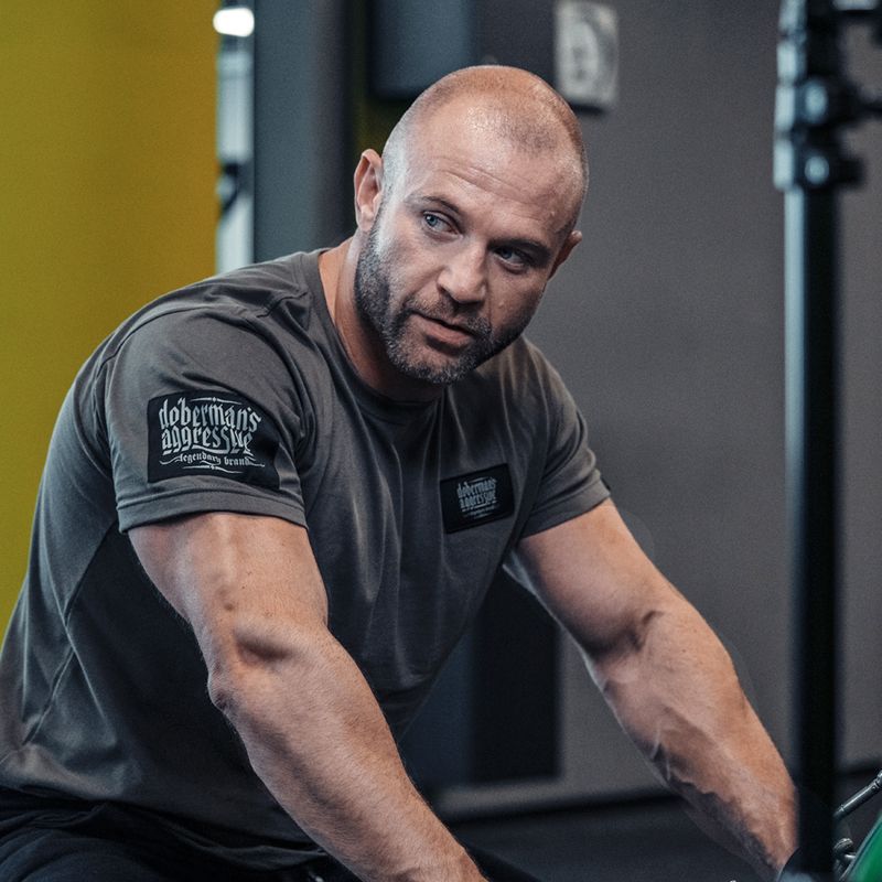 Normál szabású férfi póló minőségi pamutból. A mellkas bal oldalán a Doberman’s Aggressive fekete márkajelzése látható. Az ujjára a márka logójával ellátott címke van varrva.