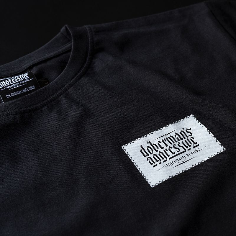 A póló 200 g súlyú pamutból készült. A bal ujjon egy kis méretű Doberman's Aggressive logó található. A póló elején egy vékony fonallal varrt márkalogó található. A póló dizájnja érdekes hatást kelt.