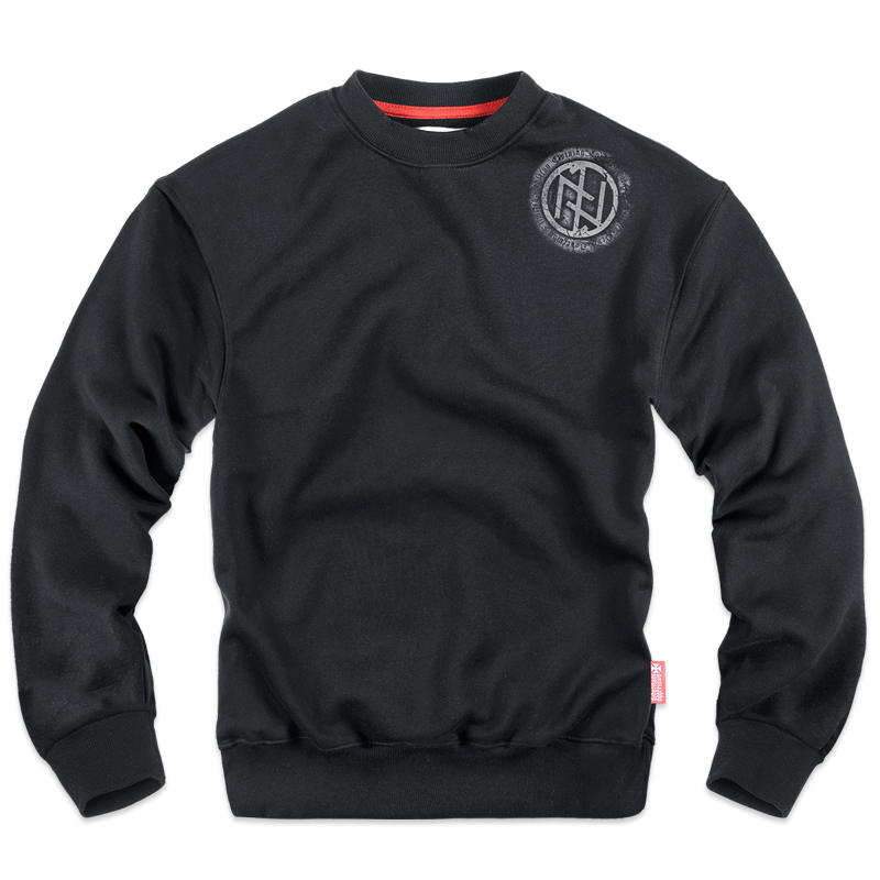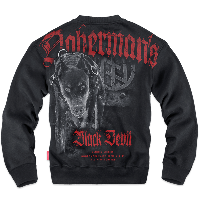 Férfi pulóver klasszikus Dobermans kollekció motívumával. Hátoldalon grafika díszítéssel amelynek repedés hatása láthato. Központilag Doberman alak minta, fentebb nagy Doberman's felirta amely átmegy mindkét ujj varratán át, lejebb Black Devil felirat. Kihasznált gótikus betűtípusok.Bal vállán egy öralak runai szimbólumokkal.Klasszikus pulóver. Egyenes vágású, tartós mandzsettával, nyakknal elvarrás kontrasztos színben. Kiváló minőségű pamutból készült.