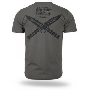 Klasszikus szabású rövid ujjú férfi póló, amely 200 g súlyú pamutból készült. A bal ujjon egy kis méretű Doberman's Aggressive logó található.A hátoldalon nagy 3D puff nyomat látható, amely keresztbe tett taktikai késeket ábrázol felfelé mutató pengékkel és a "COMBAT TACTICS & STRATEGY" felirattal. A grafika felett a "DOBERMANS AGGRESSIVE" márkalogó található. Az eleje sima, minta nélküli.