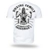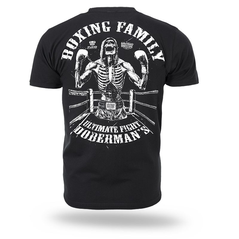 Klasszikus szabású rövid ujjú férfi póló, amely 200 g súlyú pamutból készült. A bal ujjon egy kis méretű Doberman's Aggressive logó található. A grafika felett a "Boxing Family" sorozat neve, alatta pedig az "Ultimate Fight Doberman's" felirat olvasható. Az elején, a bal mellkason egy kis logó található boksz témával.