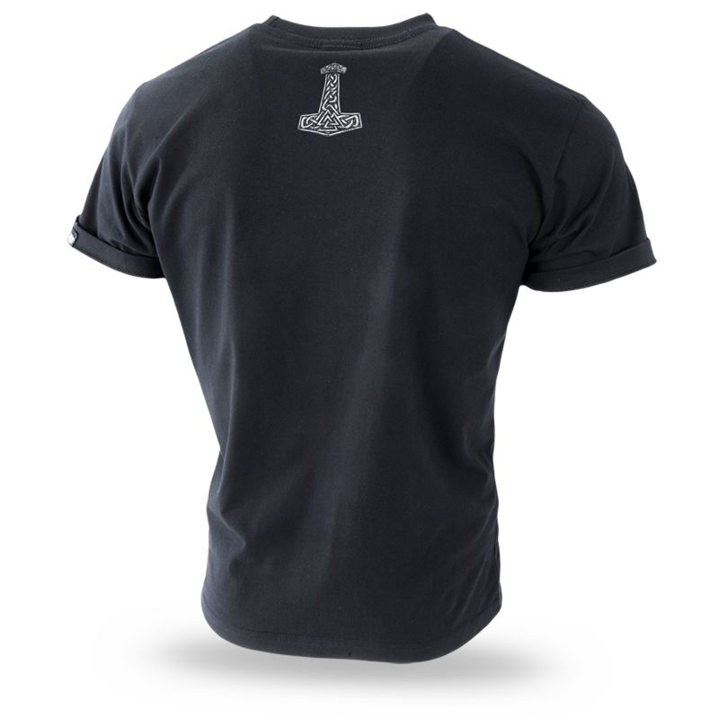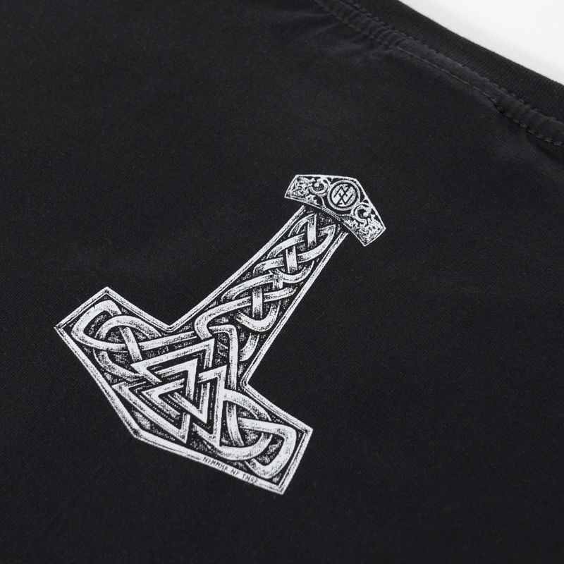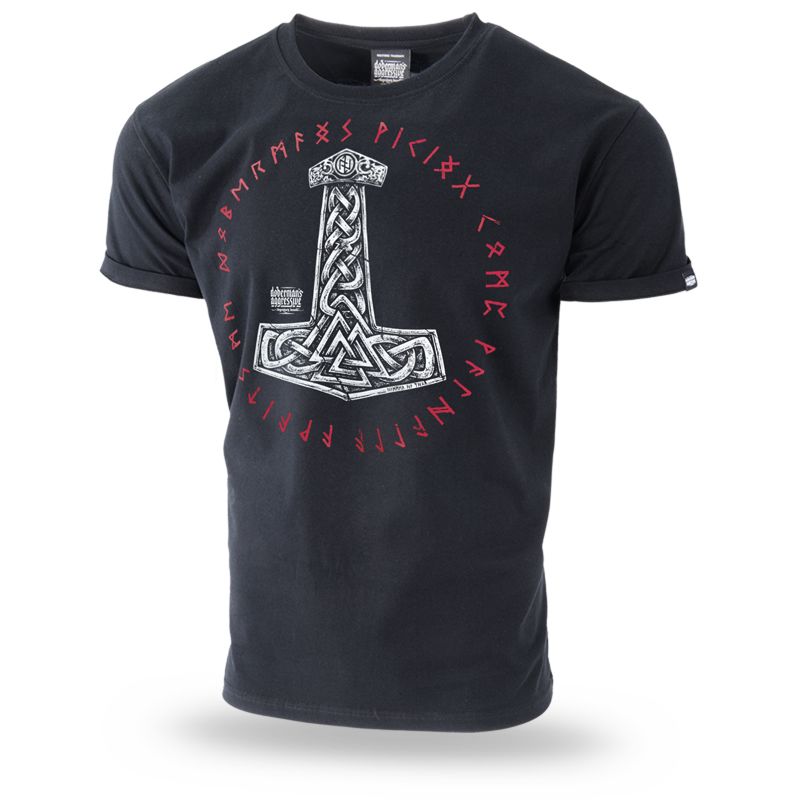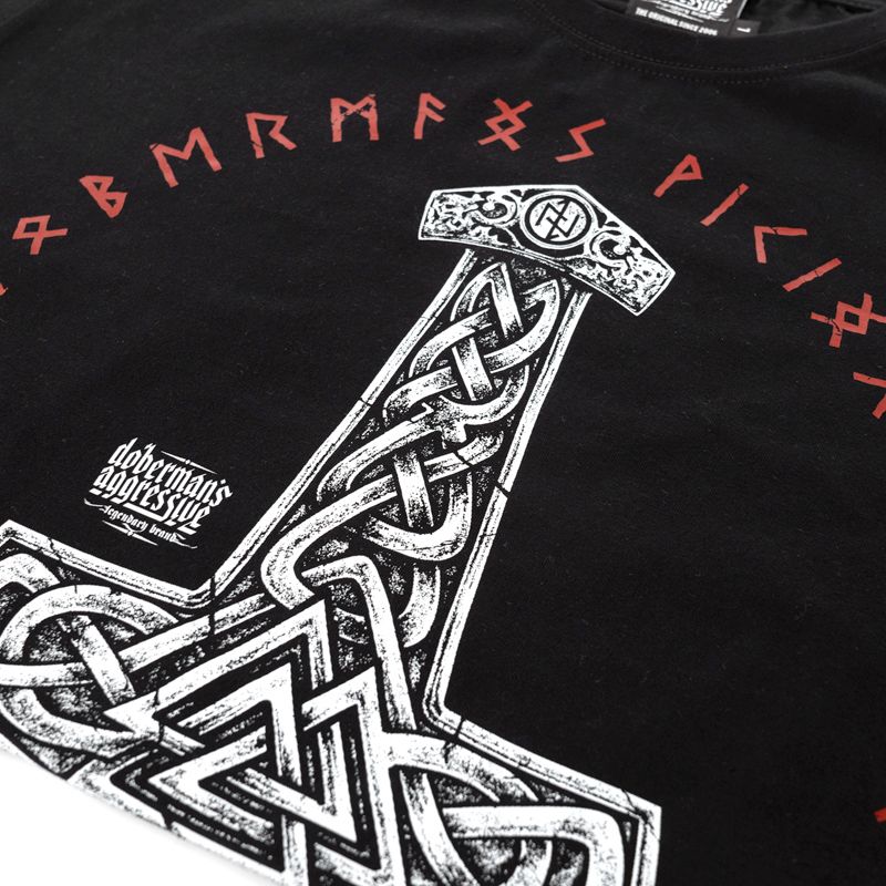 Klasszikus szabású férfi póló, amely kiváló minőségű pamutból készült. A póló bal ujján egy kis méretű céges logó található. A póló elején egy Thor kalapács és a márka logója található, amely piros rúna szimbólumokkal van körülvéve. A póló hátoldalán egy kis méretű Thor kalapács mintája található.