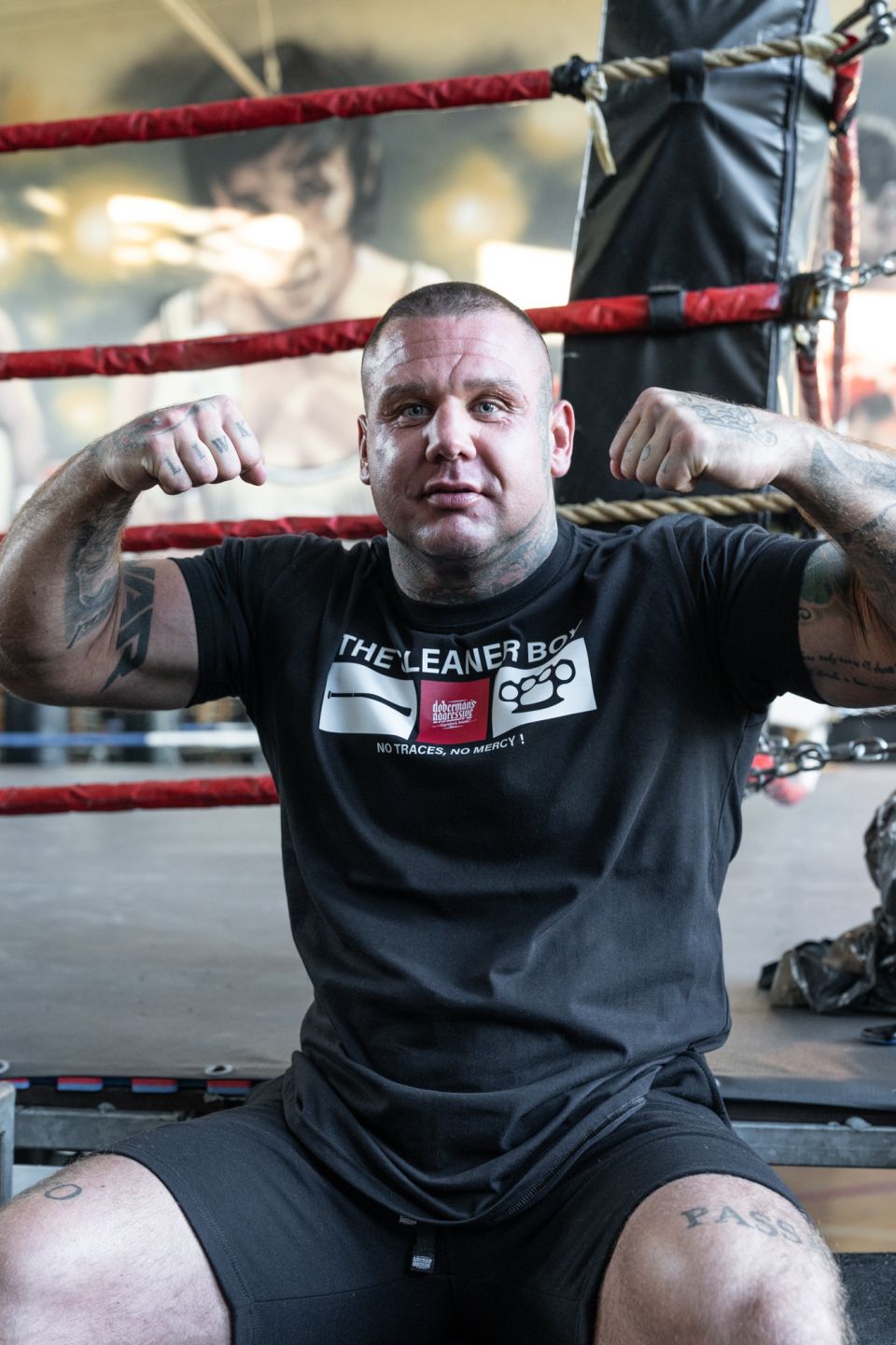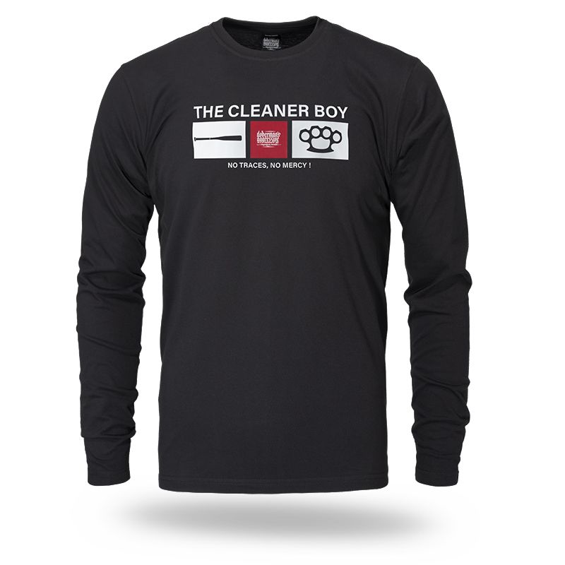 Klasszikus hosszú ujjú férfi póló elasztikus nyakszegéllyel.A póló kiváló minőségű pamutból készült. A bal ujjon egy kis címke található a márka logójával. A középső részen „THE CLEANER BOY” felirat és egy nyomat látható, amely baseballütőt, márkalogót és boxert ábrázol. Alatta a szlogen: „NO TRACES, NO MERCY!”.