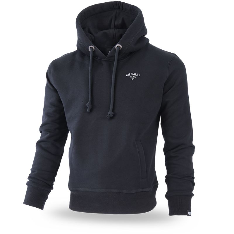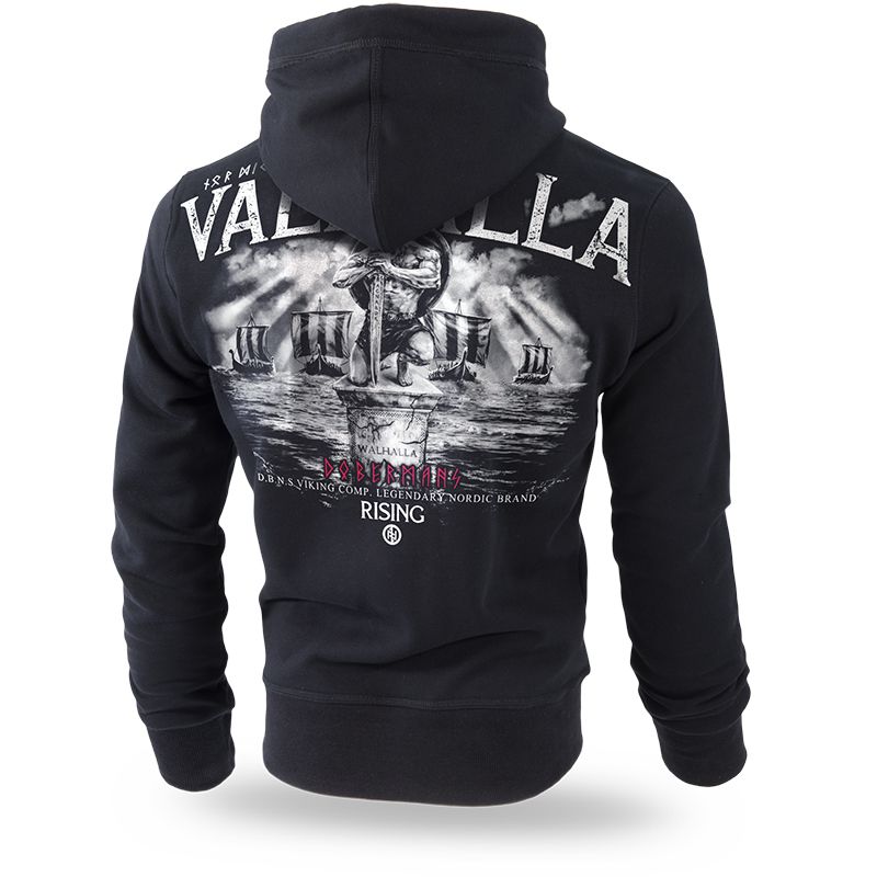 Férfi kenguruzsebes pulóver, praktikus kapucnival és tágas zsebbel. A kapucni vastag fűzőkkel rendelkezik, melynek végein fémből készült logók találhatóak. A pulóver alsó részén és az újjak végein elasztikus szegély található. A pulóver kiváló minőségű 320 g-os pamutból készült. A pulóver bal ujján Dobermans Aggressive céges logó. A pulóver elülső részén rúnikus szimbólum és Valhalla felirat. A pulóver hátoldalán egy nyomat található, amely szinte a teljes felületet elfoglalja. A nyomat egy talapzaton álló vikinget ábrázol, amint a kardjára támaszkodik. Mögötte tenger és kifeszített vitorlájú drakkarok. A modelt a skandináv kultúra ihlette.