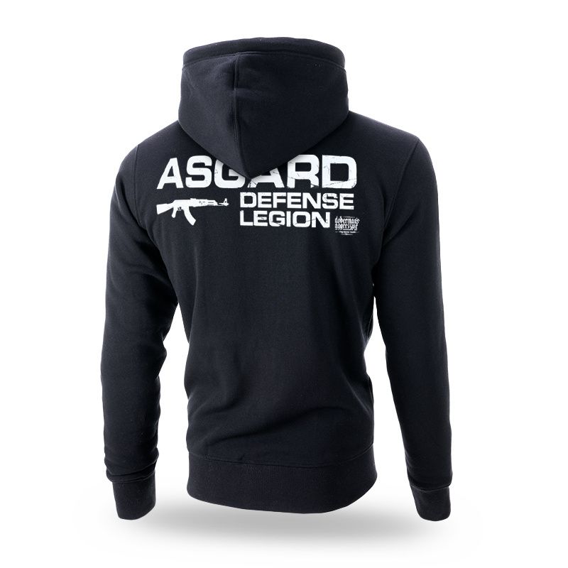 Cipzárral ellátott férfi kapucnis pulóver húzózsinóros szegéllyel. A pulóver kiváló minőségű pamutból készült és az elején két zseb található. A pulóver bal ujján egy kis méretű céges logó található. A pulóver hátoldalán egy "Asgard Defense Legion" felirat található. A feliratot egy Doberman's logó egészíti ki.