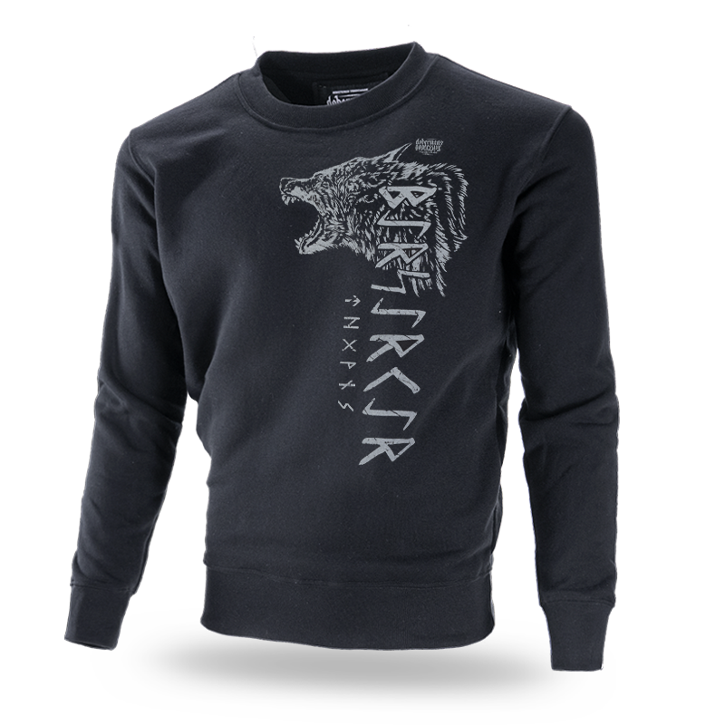 Klasszikus férfi pulóver, amely kiváló minőségű pamutból készült, súlya 320 g. A bal ujjon egy kis címke található a márka logójával. A pulóver elején egy nyitott szájú farkasfejet ábrázoló minta található, BERSERKER felirattal és céges logóval kiegészítve.