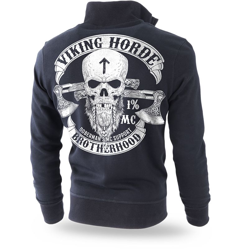 Pamutból készült férfi pulóver, cipzárral és magas gallérral, amely tökéletesen véd a hidegtől. A pulóver alsó részén és az újjak végein elasztikus szegély található. A pulóver kiváló minőségű pamutból készült. A pulóver elején két praktikus zseb található. A pulóver belsejében egy Dobermans Aggressive céges logó található. A pulóver hátoldalán egy nyomat található, amely egy Viking koponyát és két fejszét ábrázol. Körülötte két zászló, amelyeket Viking Horde és Broterhood felirat díszít. A pulóver elején lévő nyomat három kisebb koponyát ábrázol.