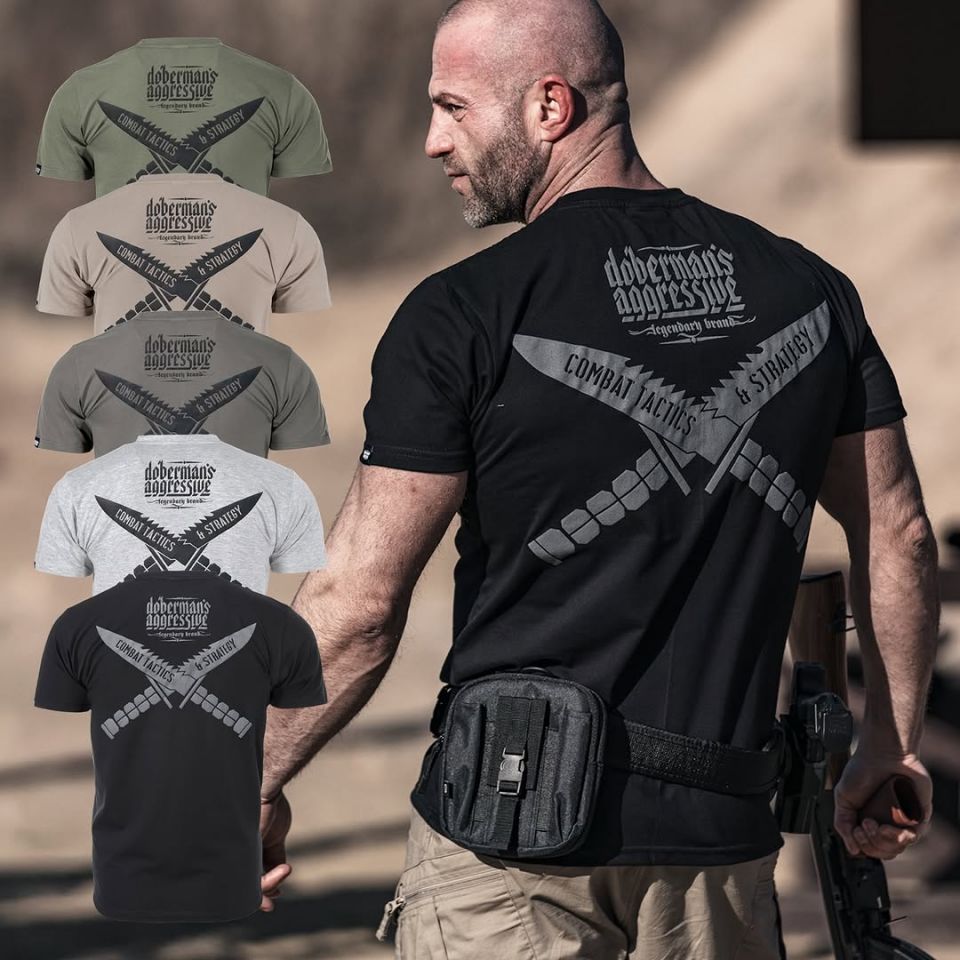 Klasszikus szabású rövid ujjú férfi póló, amely 200 g súlyú pamutból készült. A bal ujjon egy kis méretű Doberman's Aggressive logó található.A hátoldalon nagy 3D puff nyomat látható, amely keresztbe tett taktikai késeket ábrázol felfelé mutató pengékkel és a "COMBAT TACTICS & STRATEGY" felirattal. A grafika felett a "DOBERMANS AGGRESSIVE" márkalogó található. Az eleje sima, minta nélküli.