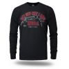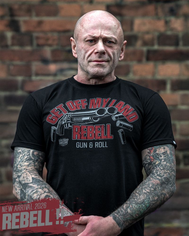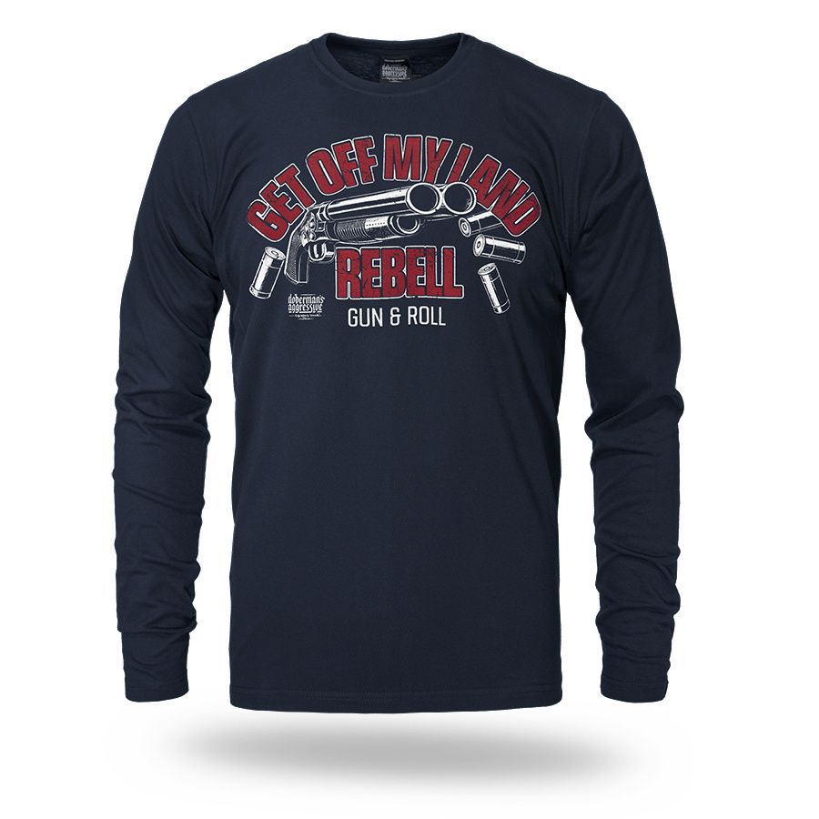 Klasszikus hosszú ujjú férfi póló elasztikus nyakszegéllyel. Kiváló minőségű pamutból készült, amely kényelmet és szabad mozgást biztosít. Az elején feltűnő nyomat található fegyver motívummal és a „Get Off My Land REBELL Gun & Roll” felirattal, amely erőteljes, karakteres megjelenést kölcsönöz a modellnek. A hátoldal sima, további díszítés nélkül. Ideális választás mindennapi viselethez azok számára, akik kedvelik a merész dizájnt és a kifejező üzenetet.