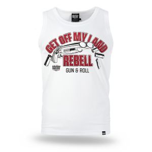 Klasszikus ujjatlan póló egyenes szabással, kerek nyakkivágással és széles karöltőkkel. Magas minőségű pamutból készült, amely kényelmet és szabad mozgást biztosít. Az elején egy feltűnő nyomat található fegyver motívummal és a „Get Off My Land REBELL Gun & Roll” felirattal, amely erőteljes, karakteres megjelenést kölcsönöz a modellnek. A hátoldal sima, további díszítés nélkül. Ideális választás melegebb napokra vagy réteges öltözködéshez azok számára, akik kedvelik a merész dizájnt.