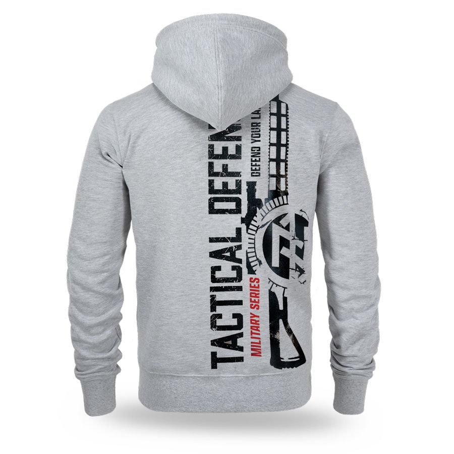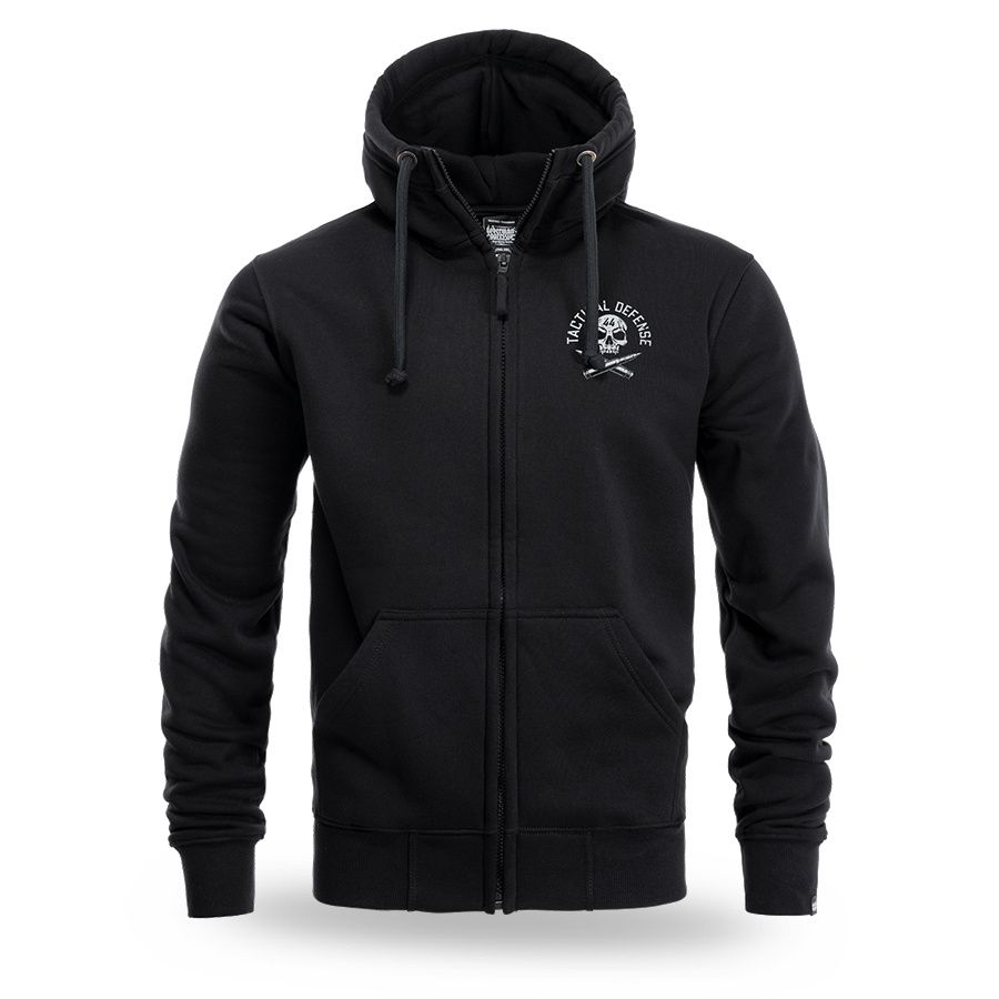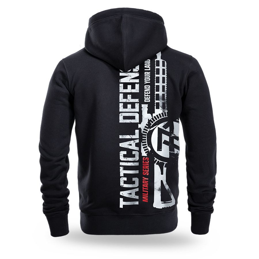 A modell kiváló minőségű, puha tapintású anyagból készült, amely kényelmet és tartósságot biztosít. A pulóver állítható kapucnival és húzózsinórral, teljes hosszúságú, erős cipzárral, valamint két praktikus elülső zsebbel rendelkezik. A bordázott ujjvégek és alsó szegély megfelelő illeszkedést és védelmet nyújtanak a hideg ellen. A mellrészen visszafogott grafika található koponya és keresztezett fegyverek motívumával, míg a hátrészen nagyméretű, katonai stílusú grafika látható függőleges „TACTICAL DEFENSE” felirattal, „DEFEND YOUR LAND” szlogennel és „MILITARY SERIES” jelöléssel. Az összhatás taktikai és katonai ihletésű karaktert hangsúlyoz.