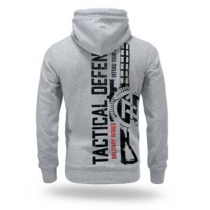 Kiváló minőségű anyagból készült, amely kényelmet és tartósságot biztosít. A pulóver állítható kapucnival és zsinórral, valamint bordázott mandzsettával és alsó résszel rendelkezik a megfelelő illeszkedés érdekében. A hátoldalon nagy, függőleges „TACTICAL DEFENSE” felirat található fegyvermotívummal és „Military Series” szöveggel, míg az elején diszkrét koponyás és keresztezett fegyveres logó helyezkedik el a mellrészen. Ideális választás azok számára, akik kedvelik a katonai stílust és a markáns grafikát.