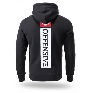 Kiváló minőségű pamutból készült kenguruzsebes pulóver, kapucnival és nagy zsebbel az elején. A pulóver alsó része és az ujjak végei széles húzózsinórral vannak ellátva. A bal ujjon egy kis címke található a márka logójával. A hátoldalon függőleges nyomat "OFFENSIVE" felirattal, fölötte egy kis márkalogóval. Minimalista részletként egy kis logó található a mellkason. A teljes hosszúságú cipzár megkönnyíti a fel- és levételt.