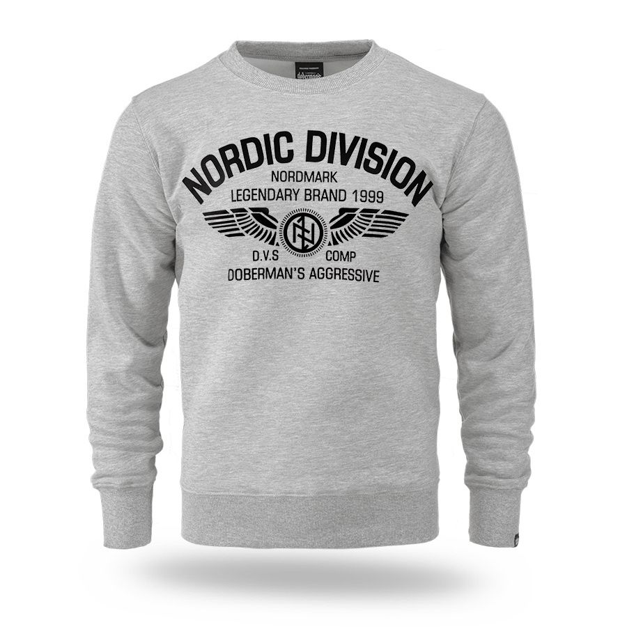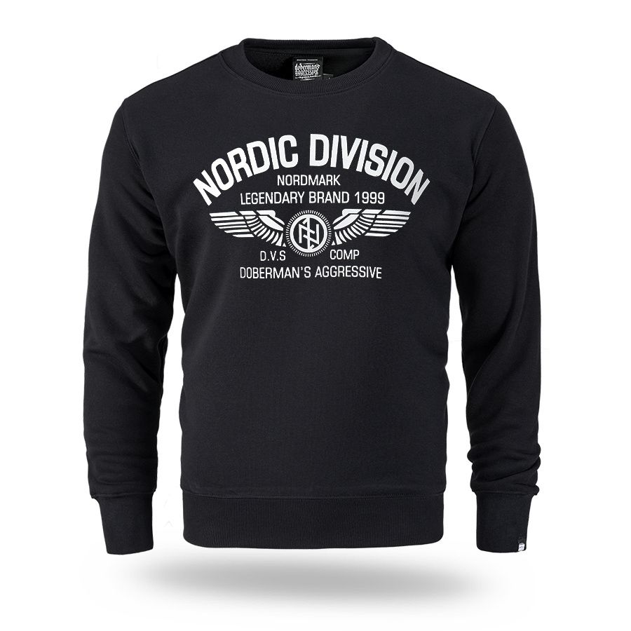 Kényelmes, klasszikus szabású modell kerek nyakkivágással, amelyet rugalmas passzé zár le. Az elején egy nagyméretű nyomat található „Nordic Division – Nordmark Legendary Brand 1999” felirattal, amelyet szárnyakat ábrázoló grafika és a márka emblémája egészít ki. A design északi és katonai stílus által inspirált, amely kiemeli a márka jellegzetes és könnyen felismerhető karakterét. Az ujjak és az alsó rész rugalmas passzéval készültek, így biztosítva a megfelelő illeszkedést és a kényelmes mindennapi viseletet.