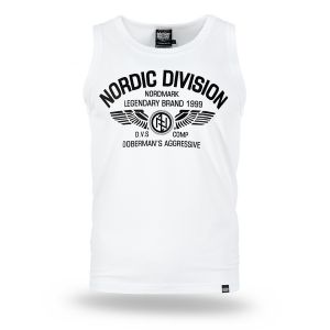 Kényelmes, klasszikus szabású modell, amely szabad mozgást és mindennapi kényelmet biztosít. Az elején egy nagyméretű nyomat található „Nordic Division – Nordmark Legendary Brand 1999” felirattal, amelyet szárnyakat ábrázoló grafika és a márka emblémája egészít ki. A design északi és katonai stílus által inspirált, amely kiemeli a márka jellegzetes és könnyen felismerhető karakterét. Az ujjatlan póló kerek nyakkivágással és szélesebb karkivágásokkal készült, így jól illeszkedik a testhez, és alkalmas sporttevékenységekhez valamint mindennapi viselethez is.