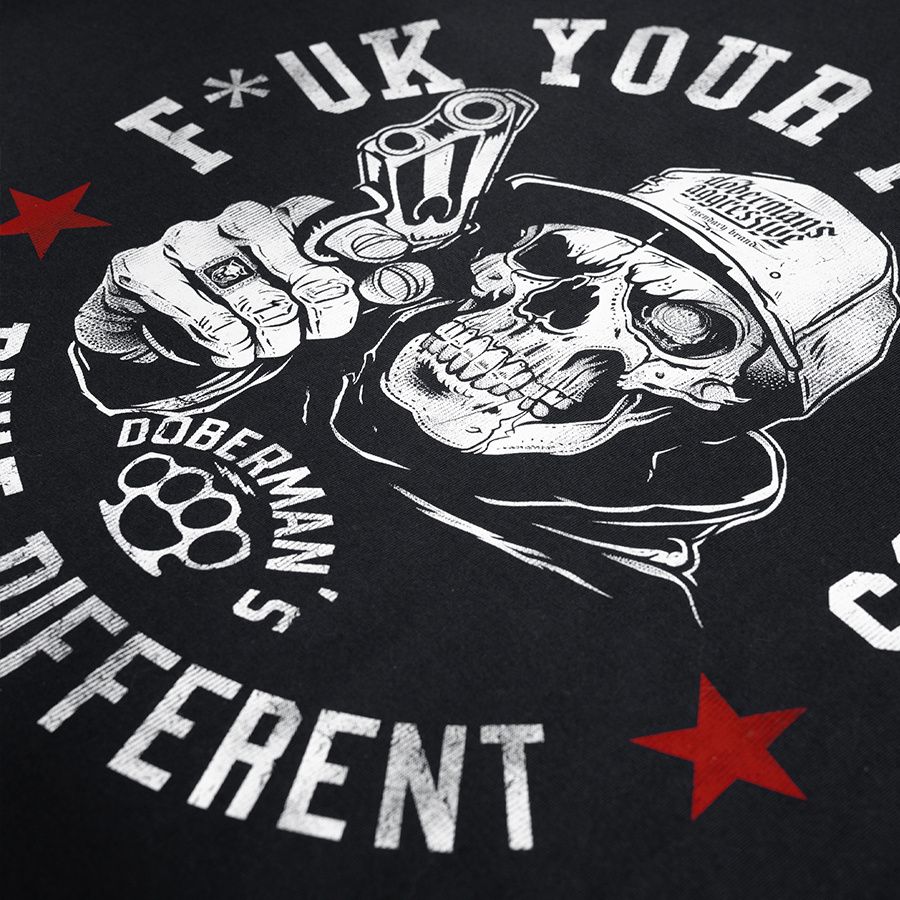 Kényelmes, klasszikus szabású modell kerek nyakkivágással, amelyet rugalmas passzé zár le. Az elején egy nagyméretű, feltűnő nyomat látható: sapkát viselő, fegyvert tartó koponya, amelyet a „F*ck Your Feelings – Built Different” felirat és a Doberman’s Aggressive márkára jellemző grafikai elemek vesznek körül. A dinamikus design lázadó és kompromisszummentes karaktert hangsúlyoz, amelyet az utcai kultúra inspirált. A póló kényelmes viseletet biztosít a mindennapokban.
