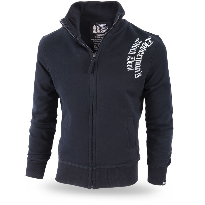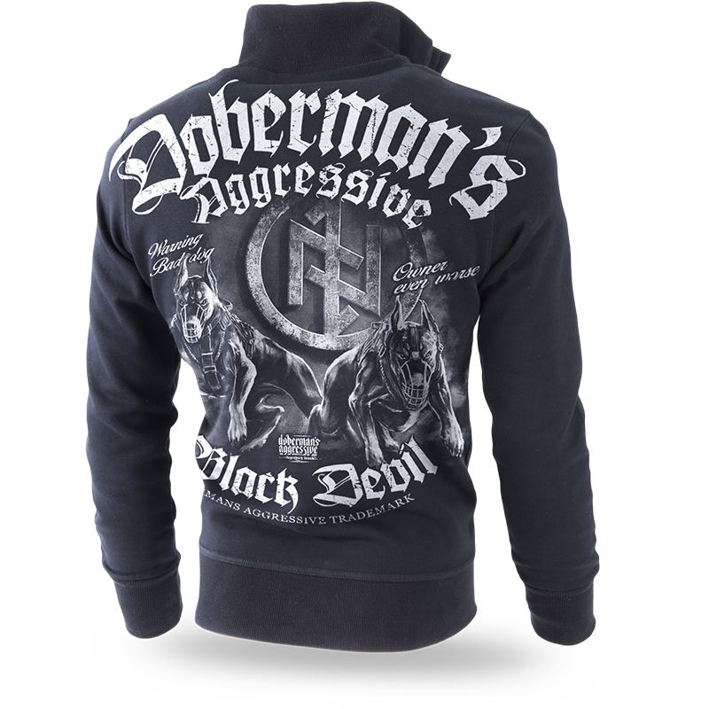 Pamutból készült férfi pulóver, magas gallérral. A pulóver alsó részén és az újjak végein elasztikus szegély található. A pulóver elején két praktikus zseb található. A pulóver kiváló minőségű pamutból készült, melynek súlya 320g. A póló hátoldalán nagy méretű nyomat, amely 2 dobermant ábrázol, háttérben rúnikus szimbólumok. Alatta Black Devil felirat, a pulóver bal oldalán Dobermans Black Devil felirattal kiegészítve.