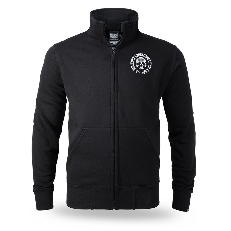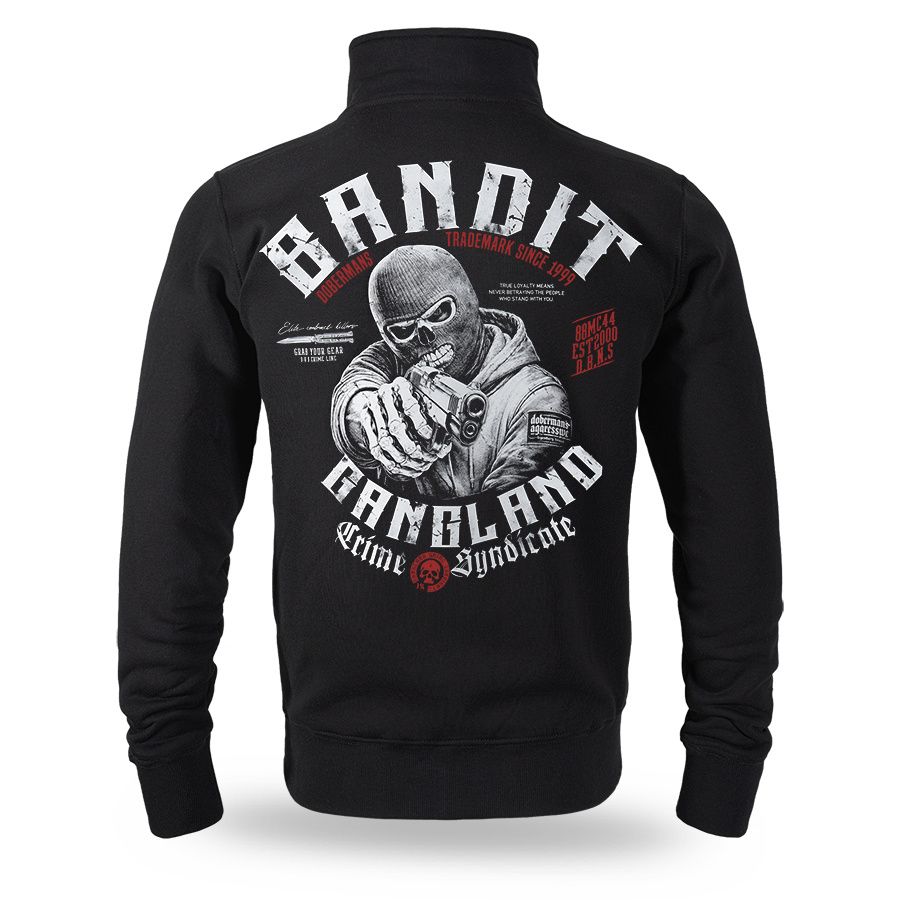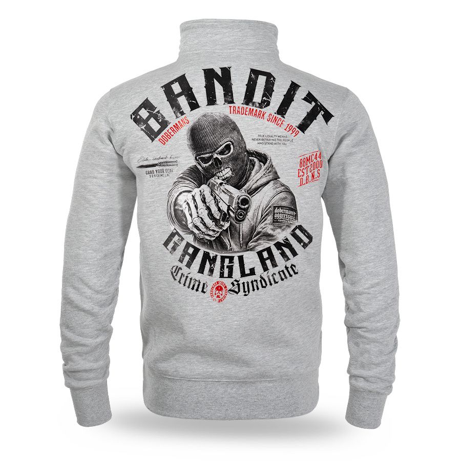 Kényelmes, klasszikus szabású modell teljes hosszában cipzárral. A pulóver magas állógallérral rendelkezik, amely segít védeni a hideg ellen, valamint praktikus oldalzsebekkel. A hátoldalon egy nagyméretű, feltűnő nyomat látható, amely egy fegyverrel rendelkező, maszkot viselő alakot ábrázol, körülötte a „Banditz Gangland Crime Syndicate” felirattal és a Doberman’s Aggressive márkára jellemző további grafikai elemekkel. Az elején mellmagasságban egy kisebb nyomat található. A rugalmas mandzsetták és az alsó passzé biztosítják a megfelelő illeszkedést és a kényelmes mindennapi viseletet.