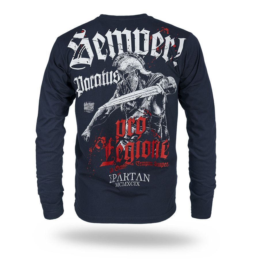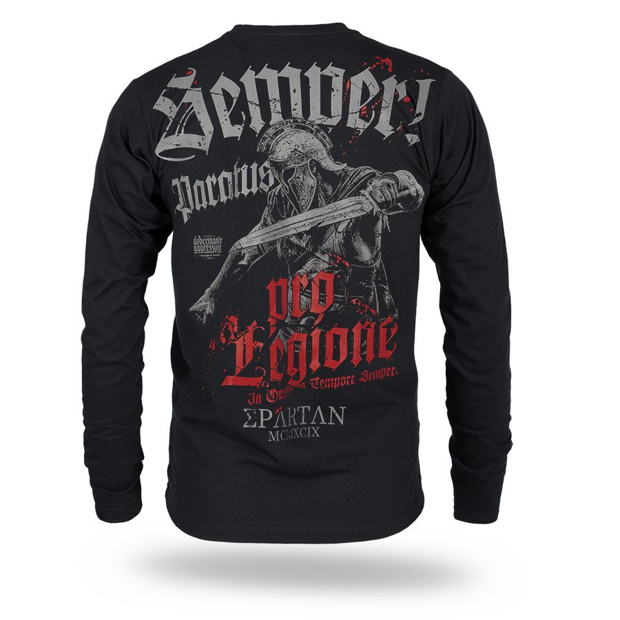 Kényelmes, klasszikus szabású modell kerek nyakkivágással és hosszú ujjakkal. A hátoldalon egy nagyméretű, dinamikus nyomat látható, amely egy sisakos, kardot tartó harcost ábrázol, valamint a „Semper Paratus” és „Pro Legione” feliratokat, amelyek a katonai szimbolikára és a harcra való készenlét szellemiségére utalnak. Az elején mellmagasságban egy kisebb nyomat található. A póló mindennapi viseletre készült, ötvözve a kényelmet a Doberman’s Aggressive márkára jellemző markáns stílussal.