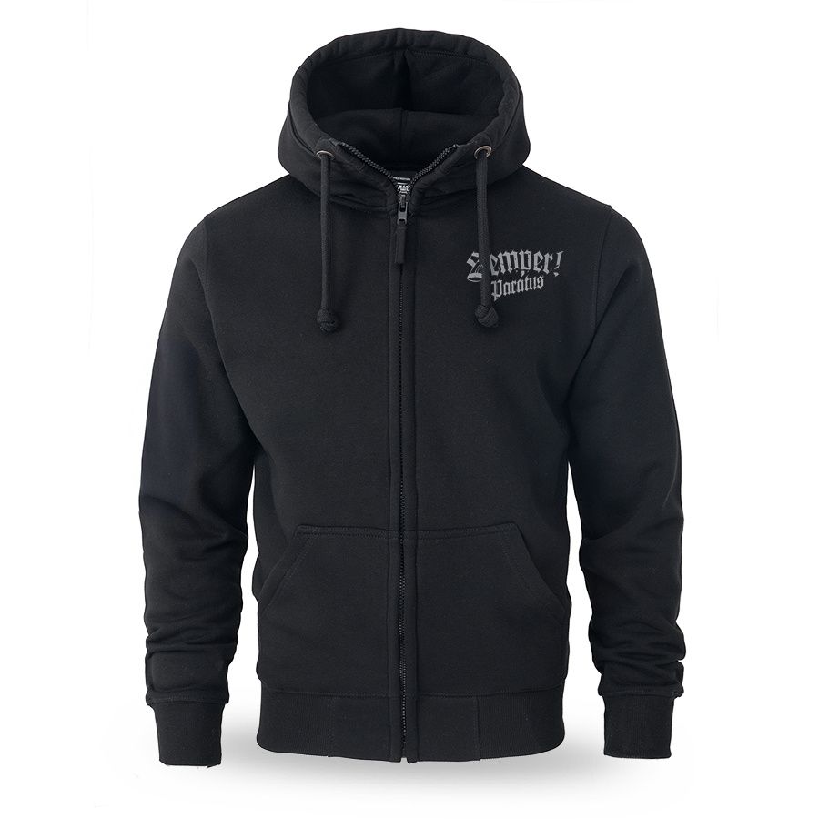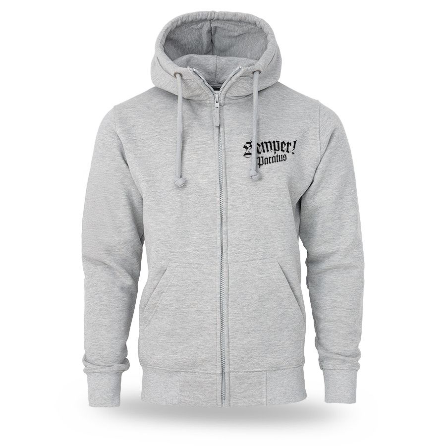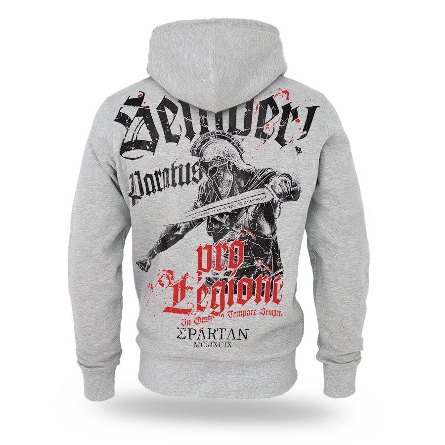 Kényelmes, klasszikus szabású modell kapucnival és állítható húzózsinórokkal, teljes hosszában cipzárral. A hátoldalon egy nagyméretű, dinamikus nyomat látható, amely egy sisakos, kardot tartó harcost ábrázol, valamint a „Semper Paratus” és „Pro Legione” feliratokat, amelyek a katonai szimbolikára és a cselekvésre való készenlét szellemiségére utalnak. Az elején mellmagasságban egy kisebb nyomat található. A pulóver praktikus oldalzsebekkel, valamint rugalmas mandzsettákkal és alsó passzéval rendelkezik, amelyek biztosítják a megfelelő illeszkedést és a kényelmes mindennapi viseletet.