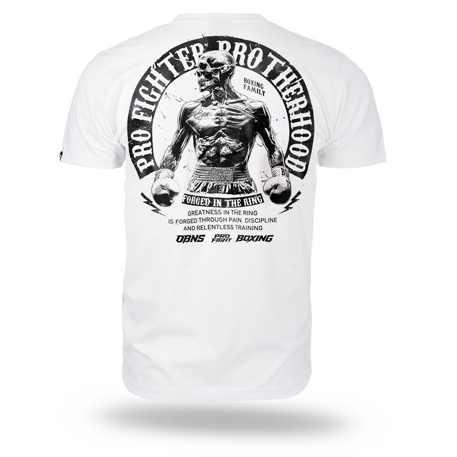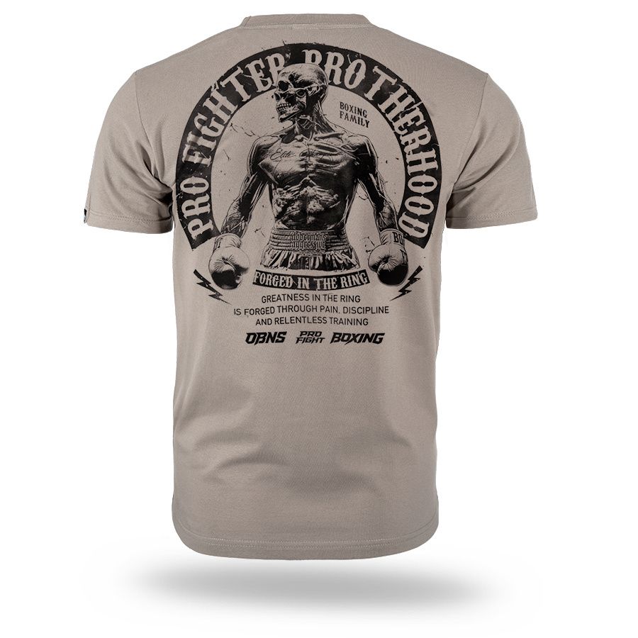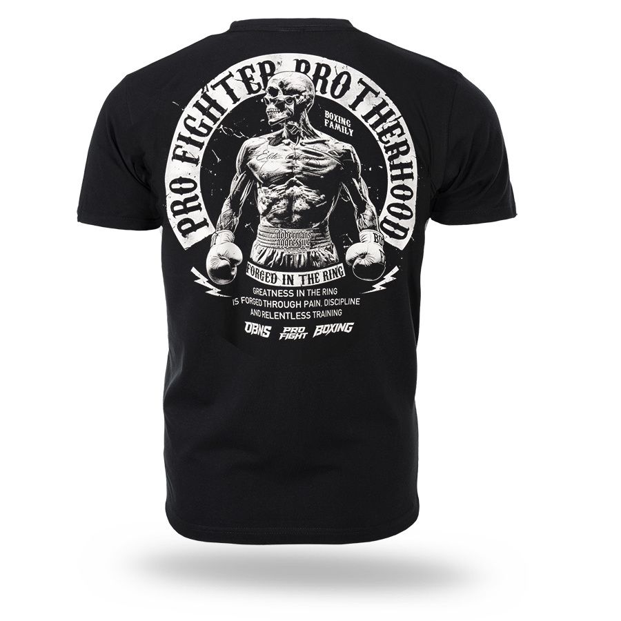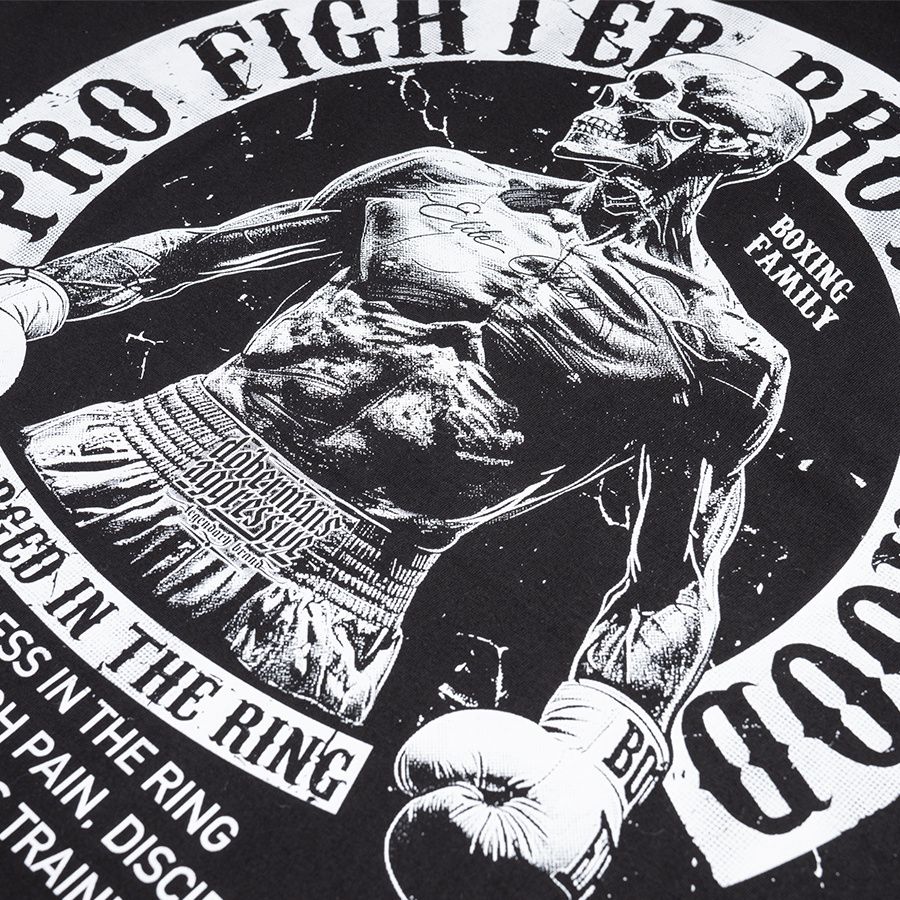 A modell kényelmes, klasszikus szabású, kerek nyakkivágással és rövid ujjakkal készült. A hátoldalon egy nagyméretű nyomat található egy bokszoló alakjával és a „Pro Fighter Brotherhood – Forged in the Ring” felirattal, amely a küzdőszellemre, az elszántságra és a testvériségre utal a küzdősportok világában. A mellrészen egy kisebb, azonos stílusú logó kapott helyet. A pólót mindennapi viseletre tervezték, amely a kényelmet a boksz által inspirált karakteres stílussal ötvözi. A gondosan elkészített nyomat és a masszív kivitelezés kiemeli a modell karakterét és tartósságát.