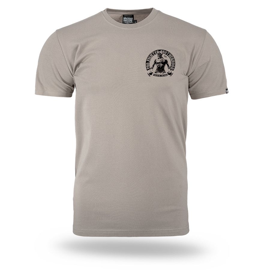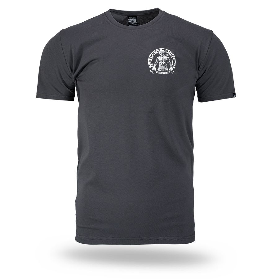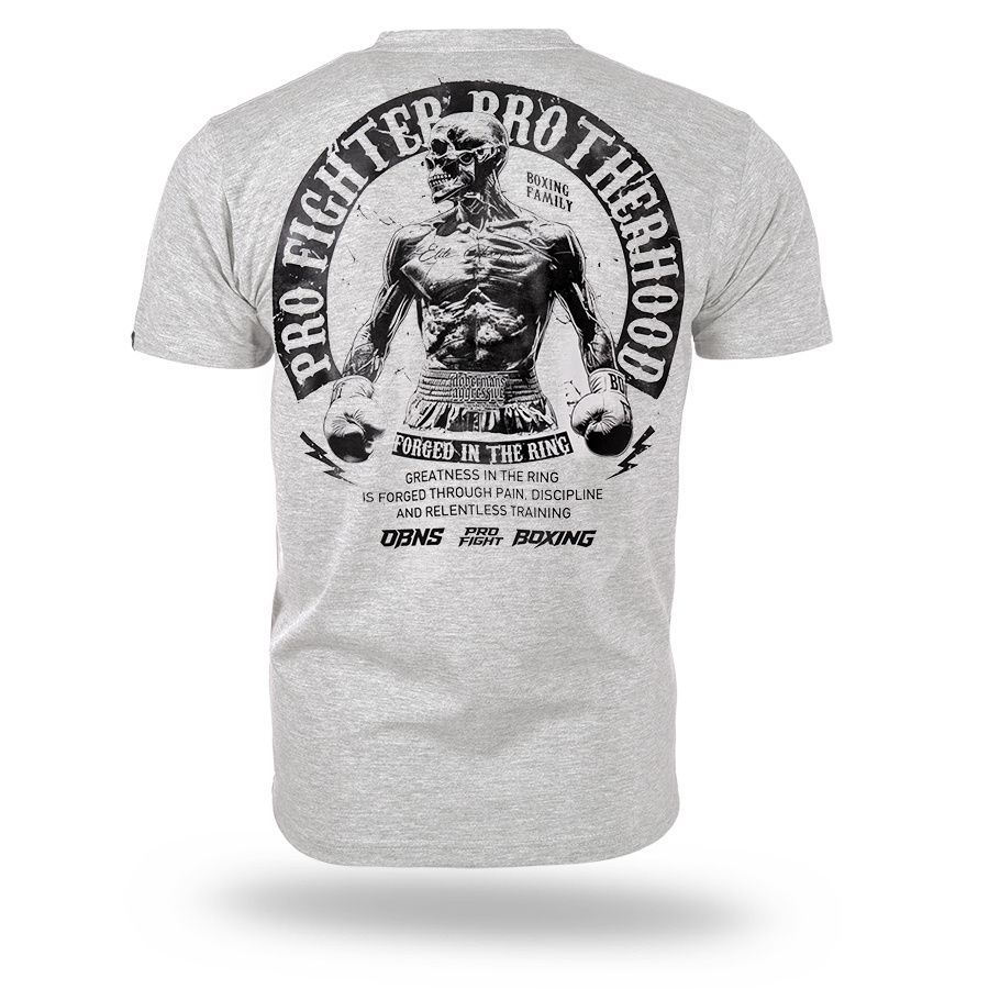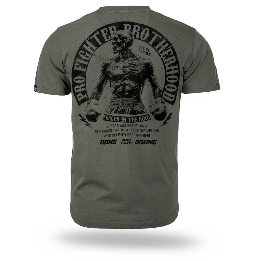 A modell kényelmes, klasszikus szabású, kerek nyakkivágással és rövid ujjakkal készült. A hátoldalon egy nagyméretű nyomat található egy bokszoló alakjával és a „Pro Fighter Brotherhood – Forged in the Ring” felirattal, amely a küzdőszellemre, az elszántságra és a testvériségre utal a küzdősportok világában. A mellrészen egy kisebb, azonos stílusú logó kapott helyet. A pólót mindennapi viseletre tervezték, amely a kényelmet a boksz által inspirált karakteres stílussal ötvözi. A gondosan elkészített nyomat és a masszív kivitelezés kiemeli a modell karakterét és tartósságát.