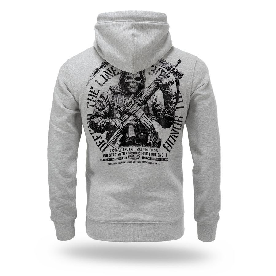 A modell kényelmes, sportos szabású, állítható zsinóros kapucnival, valamint az ujjaknál és az alsó részen bordázott szegéllyel készült a jobb illeszkedés és a kényelem érdekében. A hátoldalon egy nagyméretű nyomat látható egy taktikai stílusú, fegyveres figurával és a „Protect – Live – Honor” felirattal, amely a bátorságot, a hűséget és a cselekvésre való készenlétet szimbolizálja. A mellrészen egy kisebb, minimalista logó található. A pulóver mindennapi viseletre készült, amely a kényelmet a katonai és taktikai stílus által inspirált karakteres megjelenéssel ötvözi. A gondosan elkészített nyomat és a masszív kivitelezés kiemeli a modell karakterét és tartósságát.