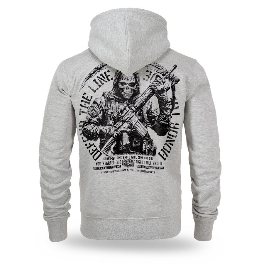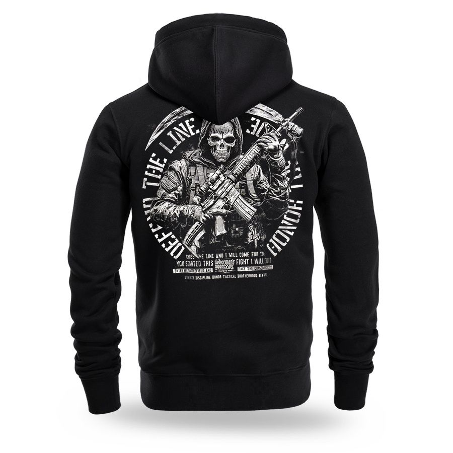 A modell kényelmes, sportos szabású, állítható zsinóros kapucnival és teljes hosszúságú cipzárral készült. A pulóver elöl praktikus zsebekkel rendelkezik, az ujjaknál és az alsó részen bordázott szegély biztosítja a jobb illeszkedést és a kényelmet. A hátoldalon egy nagyméretű nyomat látható egy taktikai stílusú, fegyveres figurával és a „Protect – Live – Honor” felirattal, amely a bátorságot, a hűséget és a cselekvésre való készenlétet szimbolizálja. A mellrészen egy kisebb, minimalista logó található. A modell a katonai és taktikai stílus esztétikájából merít inspirációt, és mindennapi viseletre készült, karakteres megjelenéssel.