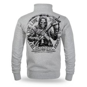 A modell kényelmes, sportos szabású, magas állógallérral, amely védi a nyakat, valamint teljes hosszúságú cipzárral készült. A pulóver elöl praktikus zsebekkel rendelkezik, az ujjaknál és az alsó részen bordázott szegély biztosítja a jobb illeszkedést és a kényelmet. A hátoldalon egy nagyméretű nyomat látható egy taktikai stílusú, fegyveres figurával és a „Protect – Live – Honor” felirattal, amely a bátorságot, a hűséget és a cselekvésre való készenlétet szimbolizálja. A mellrészen egy kisebb, minimalista logó található. A modell a katonai és taktikai stílus esztétikájából merít inspirációt, és mindennapi viseletre készült, karakteres megjelenéssel.