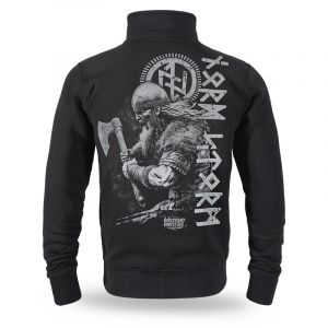 Klasszikus pulóver kiváló minőségű pamutból. Hosszú ujjú modell, rugalmas mandzsettákkal a csuklón és az alsó szegélynél. A háton egy nagy nyomat látható, amely egy vikinget ábrázol baltával, mellette rúnás felirattal. Az elején, a mellkasnál egy minimalista "STORM" felirat található.
