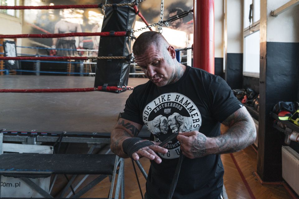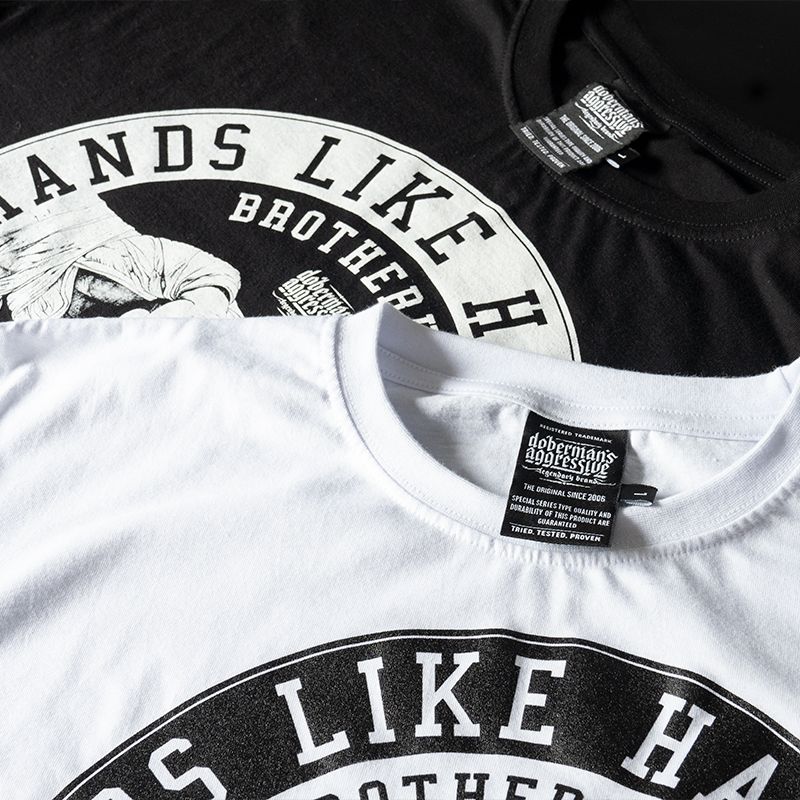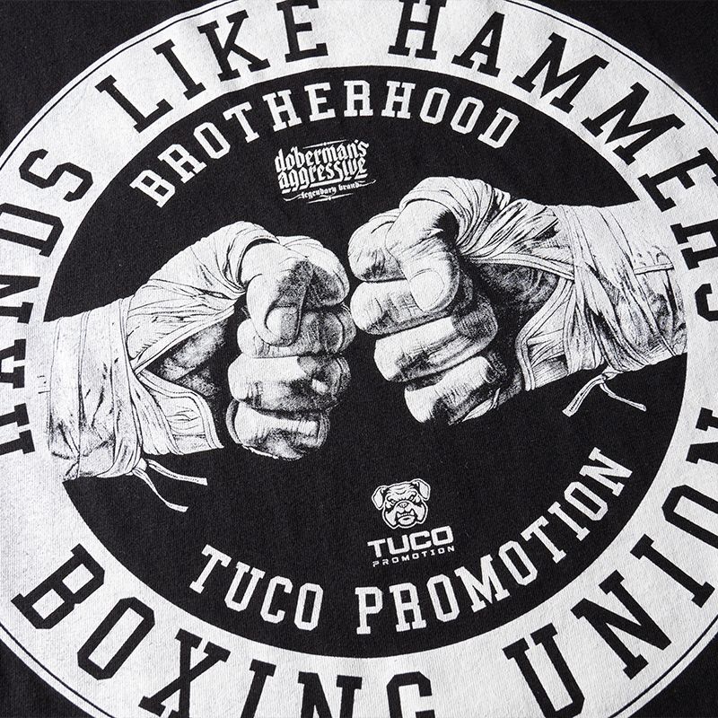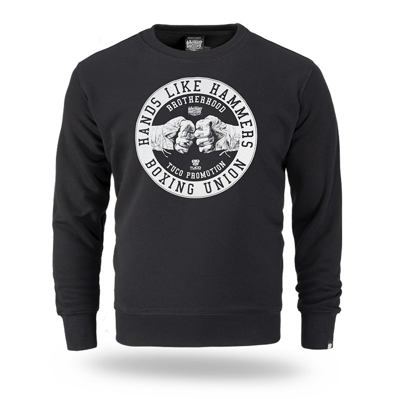 Klasszikus férfi pulóver, amely kiváló minőségű pamutból készült, súlya 320 g. A bal ujjon egy kis címke található a márka logójával. Mellkasán nagy Hands like hammer, boxing union nyomtatással.