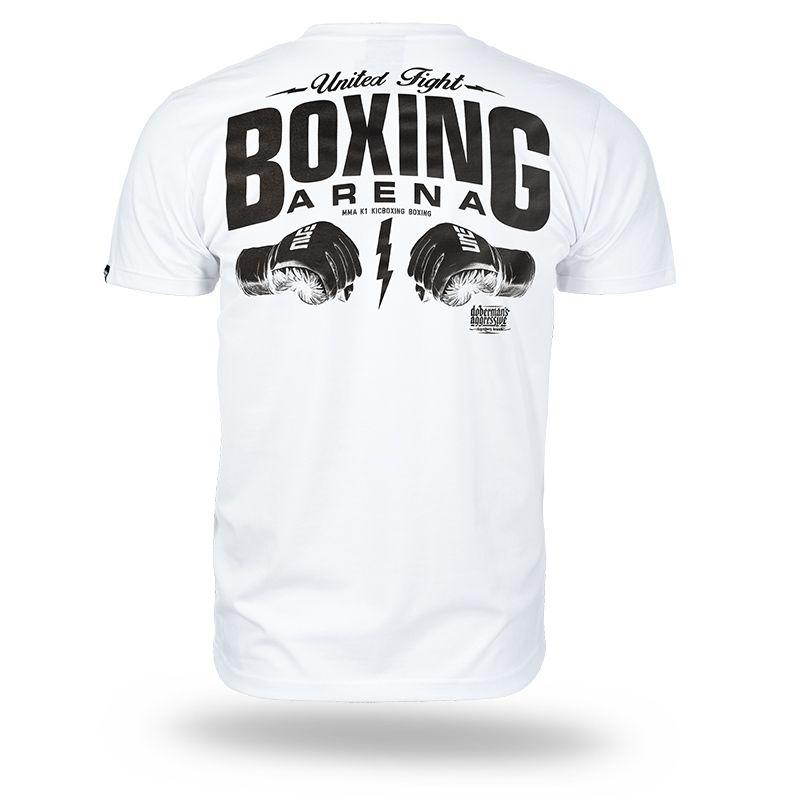Klasszikus szabású rövid ujjú férfi póló, amely 200 g súlyú pamutból készült. A bal ujjon egy kis méretű Doberman's Aggressive logó található. Sportos grafikai nyomattal ellátott modell a hátoldalon, amely összeszorított MMA kesztyűket és a “Boxing Arena” feliratot ábrázolja. A háttérben kisebb feliratok: MMA, K1, KICKBOXING, BOXING. A mellkason kisebb minta található, amely a fő motívumra utal.